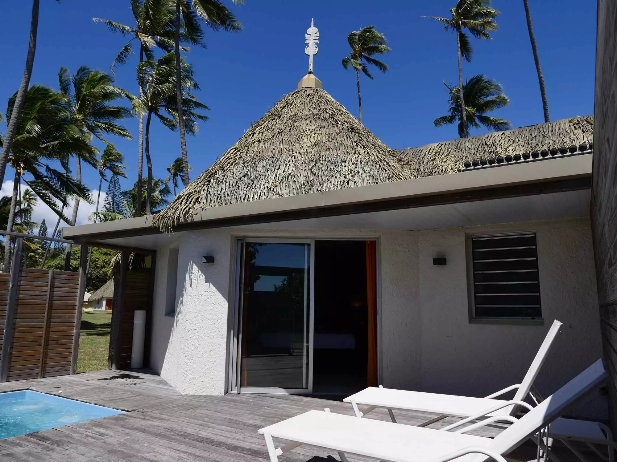 Sa terrasse aux portes coulissantes en bois tropical permets de protéger votre intimité ou d’admirer la mer tout en profitant de votre piscine.
